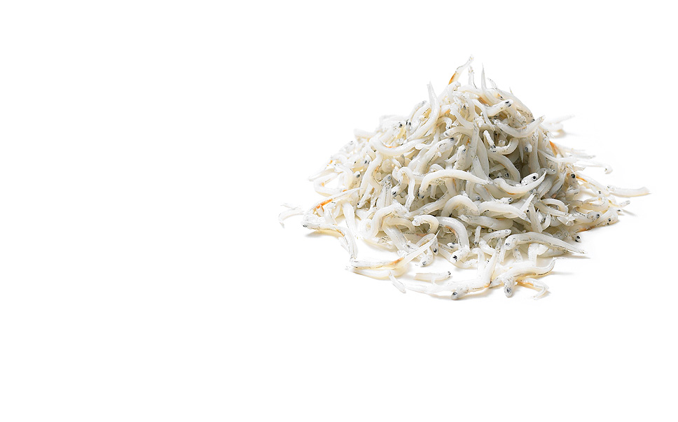まだ半透明のしらすはイワシの稚魚。 とてももろくて繊細なため、網で船上に引き上げられるとすぐに、 たっぷりの氷で冷やされたまま海辺の加工場に運ばれます。 大釜にわかしておいた塩水で一気に茹であげられたしらすには、 海の栄養がそのままつまっています。
