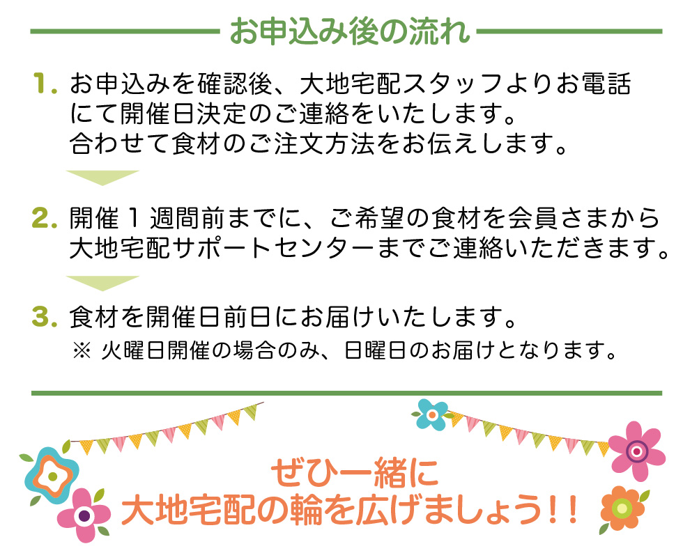 お申し込みの際の個人情報は、イベントなどの実施のために利用いたします。ご同意の上、お申し込みください。個人情報に関する詳細は、大地を守る会のホームページ(https://www.daichi-m.co.jp/corporate/privacy_policy)をご覧ください。