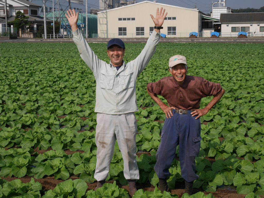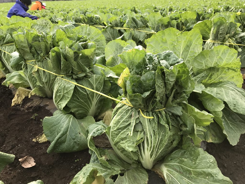 白菜の生産者・福井忠雄さん、一洋さん親子の畑では、毎年11 月・12 月、白菜の「頭縛り」を行っています。