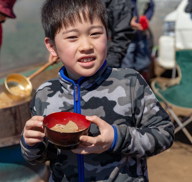 収穫体験後は、黒崎研究会のお母さんたちが作った大根汁で身も心も温まります。