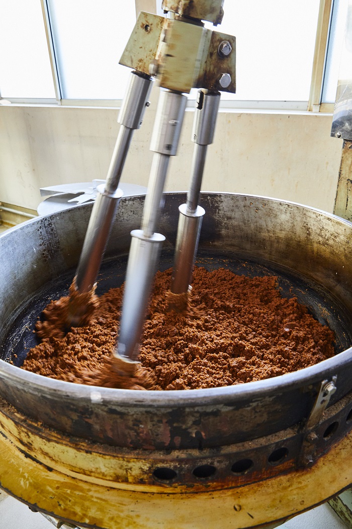 ルウ作りはまず、小麦粉・植物性油脂・調味料を釜に入れ、撹拌しながら熱します。灼熱の製造所でルウを煮詰める2時間半、職人は釜につきっ切り。表面温度を測ってはレバーをひねって火加減を変え、釜を行き来します。この火力調整が火入れと呼ばれ、温度を保つ職人技です。