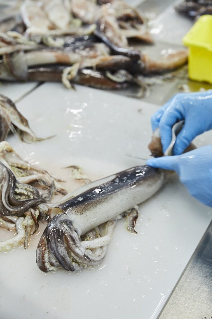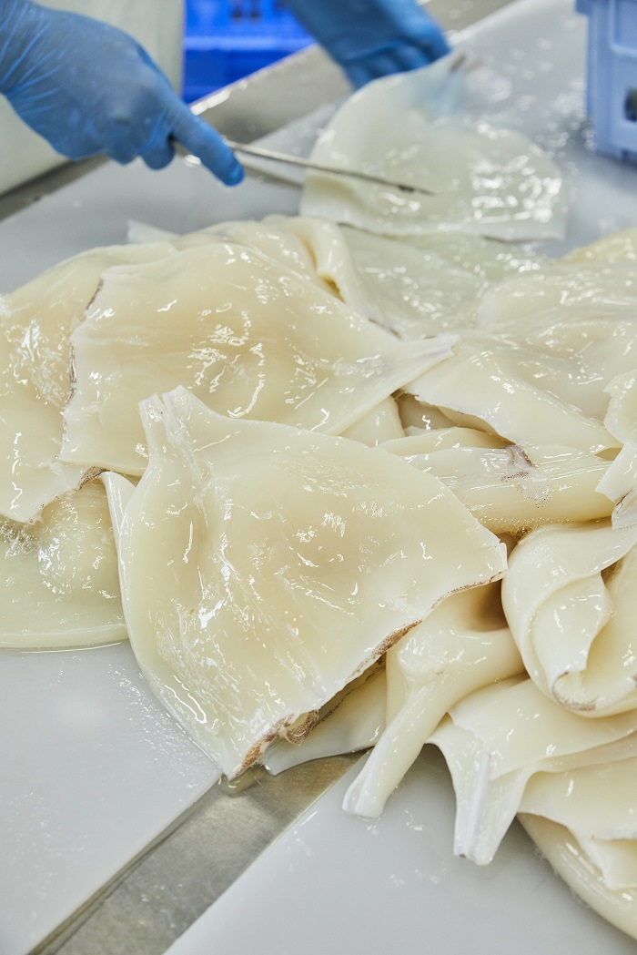 スルメイカの処理は、解凍から皮むきまでの工程を最短で行わなくてはなりません。皮の色が身に移ってしまうためです。耳と胴を包丁で切り分ける作業から始め、機械を通して皮をむき、そうめん状にします。