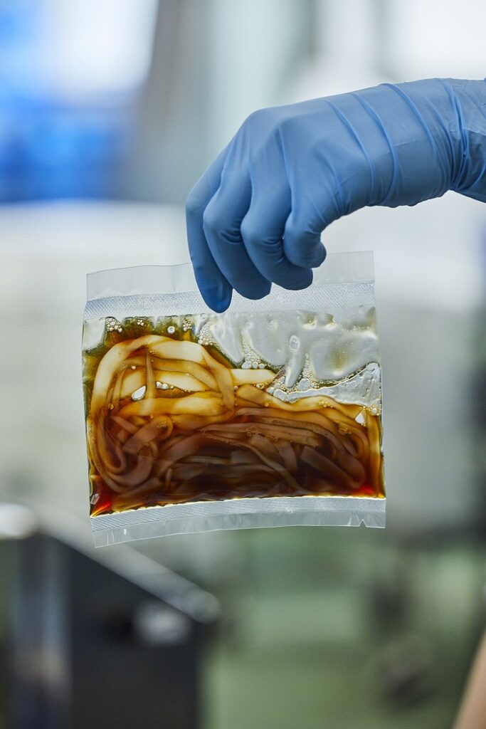 「せっかくの新鮮なイカの味を邪魔したくない」と岩田さんの思いを示すように、足すのはこのタレのみ。日本食品工業が大地を守る会専用に作っているもので、原材料はみのり醤油、三河みりんなどおなじみの顔ぶれです。タレの生産者、中西さんも実際に見て、「会員の皆さんに喜んでいただくには、ここまでしないとね」と納得の面持ちです。