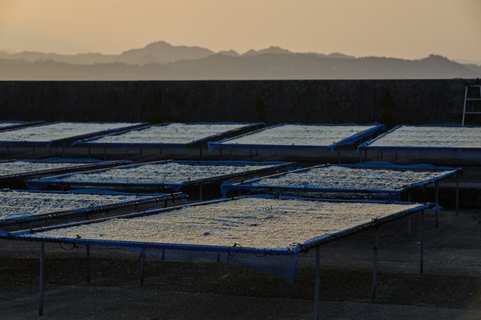干して3日目。海岸沿いに広げた大根に朝日が届きはじめていました。てんぽ印の切干し大根は機械乾燥ではなく、太陽の光と潮風に晒して乾燥させます。1回につき3日間の天日干しをシーズン中12〜14回も。当然都合よく晴れる日ばかりではありません。