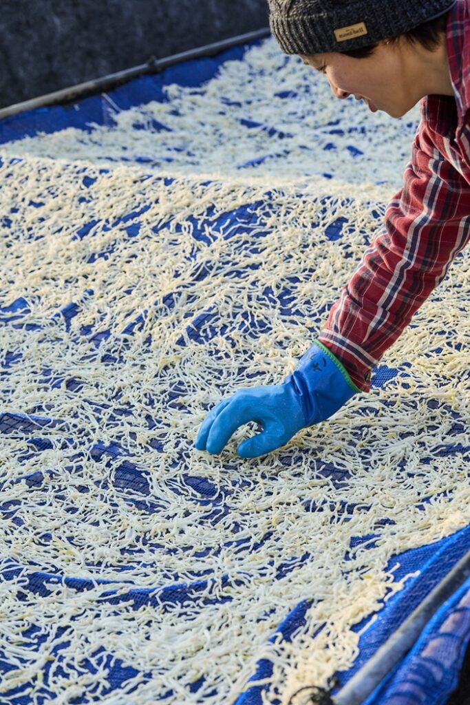「寒くて風があると、切ったその日から乾きはじめて、2日で完成することがあるんです。めったにないので〝スター期間〞って呼んでいます(笑)。暖かいと傷んでしまうので、1月下旬から3月頭までの限られた時期にしか干せないんです」