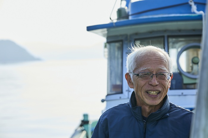 干し網を貸してくれている無茶々園のちりめんじゃこの生産者・佐藤吉彦さん(64歳)。大根が豊作だった年に、切干し大根作りを勧めてくれました。福岡県で一回就職したあとここに戻って漁師になったというUターンの先輩。