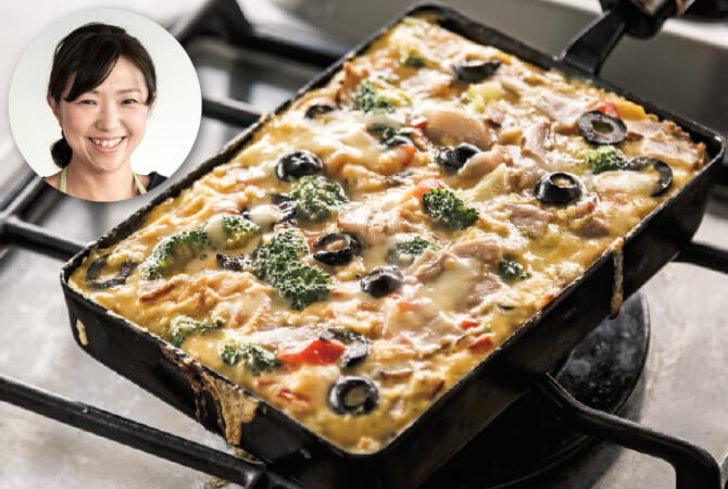 「持ち寄り会には、お酒を飲む派、飲まない派の両方が楽しめそうなものを持っていきます。このオムレツは卵焼き用のフライパンで作れるのでらくらく。ベーコンとチーズで味が付くので、塩も少ししか入れません」