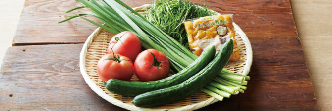 ※生育状況によって品目・量目が変わることがあります。■セット内容/モロヘイヤ100g、おかひじき80g、ニラ100g、行者菜80g、きゅうり200g、ピーマン150gから3品、トマト400gまたはミニトマト150g、洗いなめこ100gまたはまいたけ100gから2品の計5品目をお届け。