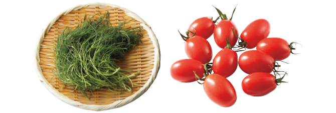 シャキッと歯ごたえの良い「おかひじき」と、糖度が高いアイコが中心のミニトマト。副菜作りに役立つ2種をセットでお届けします。