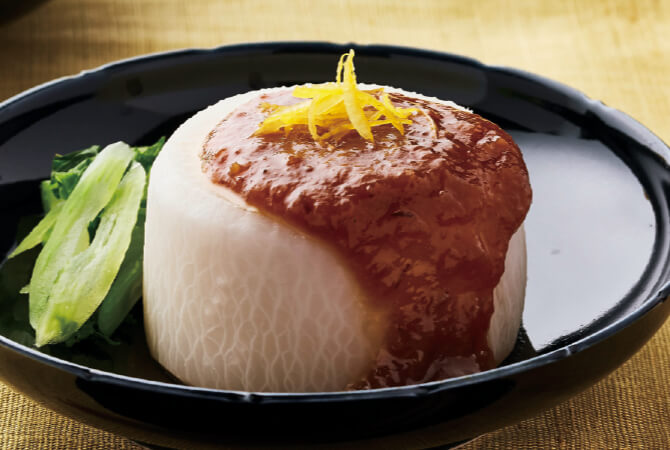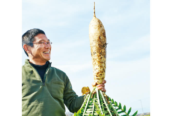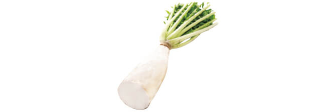 三浦大根は、中ぶくれのふと~い見ためが特徴。短い時季しか楽しめない三浦半島育ちの伝統野菜です。みずみずしくてきめが細かく熱を加えるとやわらかさが一層増します。厚めに切って味わう、ふろふき大根向き!