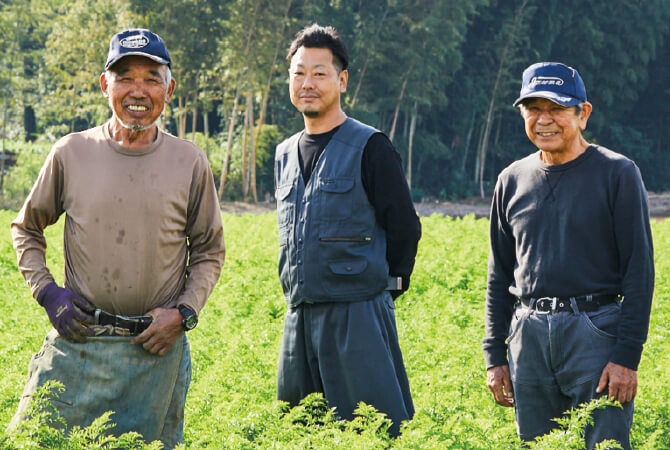 めちゃ甘ほうれんそうは、埼玉県川越市の吉沢重造さん、藤川春雄さん、深田友章さんたちがこだわりのたい肥で露地栽培したもの。寒さで甘さが増し、葉がしっかり厚くなっています。