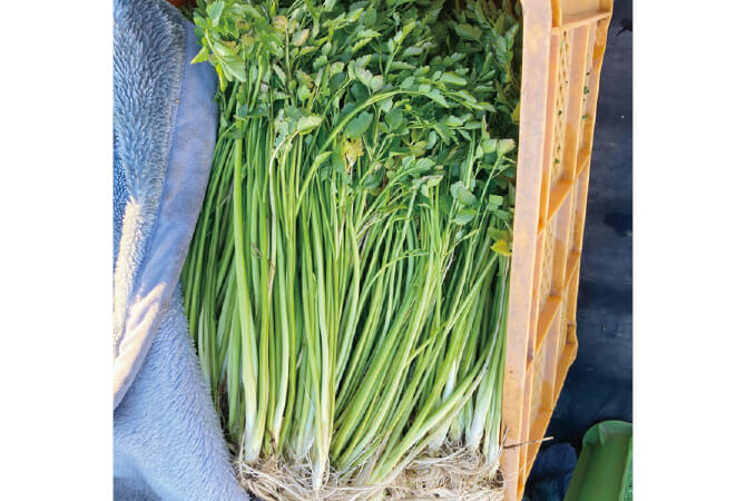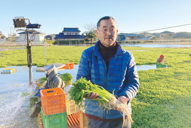茨城県行方市で親の代から農薬に頼らない栽培をしてきました。霞ヶ浦と北浦の豊かな水辺で育った「せり」は1月から2月にかけての今が収穫の最盛期。さわやかな香りとシャキシャキとした食感を存分に楽しめます。葉や茎はもちろん、長い根っこの部分まで甘みとほろ苦さがあっておいしく食べられるのが特徴です。