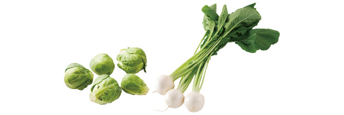 小さい葉に甘みが詰まった芽キャベツと、やわらかいかぶのセット。加熱することで甘みが一層深まるので、ポトフやシチューにおすすめです。