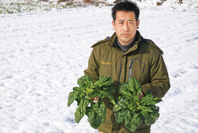 肉厚さと味の濃さの秘訣は東北ならではの厳しい寒さ。畑は盆地にあり、冬冷たい風と雪で気温は氷点下に。寒さで葉が凍らないようにデンプンなどの糖分と養分を蓄えることでおいしさが増すんです。